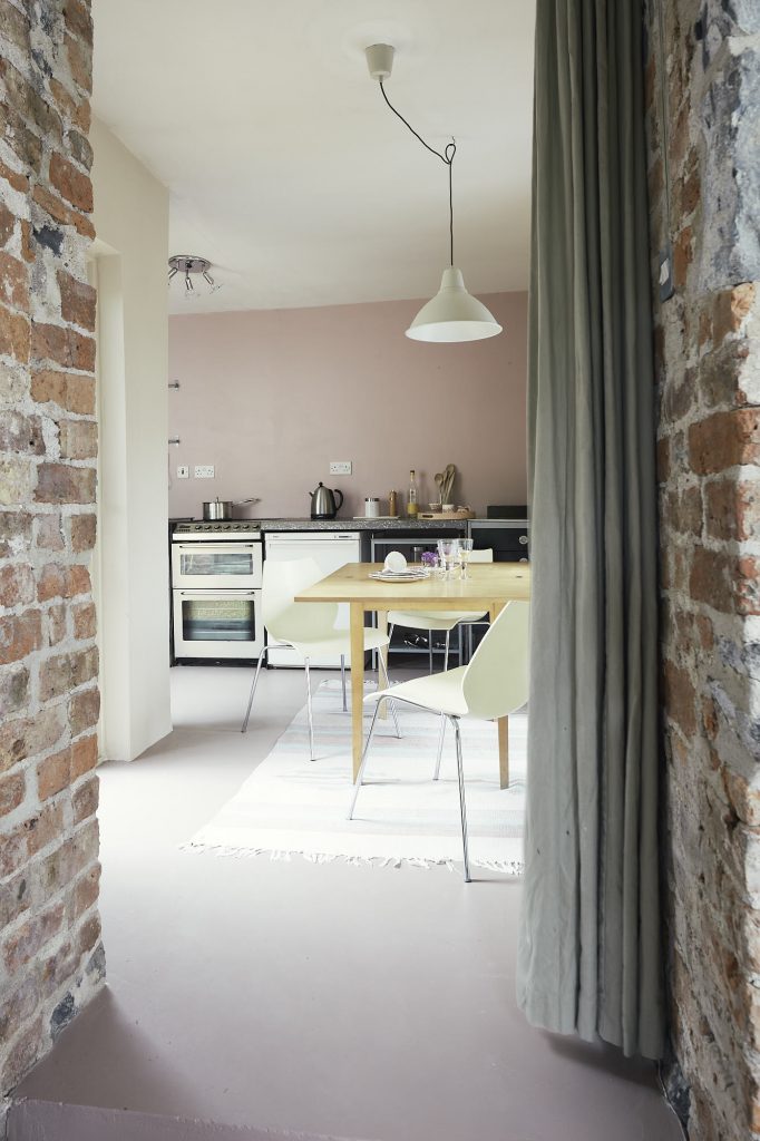 My aim was to do minimal works with maximum effect. The budget for the ground floor restructuring (not including the conservation work) was €10,000 and it has had a transformational impact on the space. I saved in some areas such as the floors. There was already a concrete floor underneath the carpet. I just removed the carpets and used floor paint over the screed, which looked good when contrasted with rugs. Another simple cost-effective tip is to paint the radiators – the one near the entrance is painted a mid-grey colour similar to the stonewall it is mounted on, in the kitchen the beige colour is used to paint the radiator and boiler, making them disappear and blend into the background.